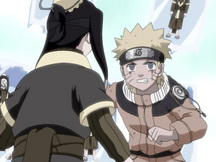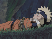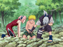 Jiraiya, Naruto und Shizune haben den Platz erreicht, an dem sich Tsunade und Kabuto im Kampf gegenüber stehen. Tsunade hat keine Chance gegen Kabuto, so dass Jiraiya sich entschließt, einzugreifen. Als Naruto ihn unterstützen will, lehnt er ab und gibt ihm stattdessen den Auftrag, auf Tsunade und das Schwein aufzupassen - was Naruto natürlich als völlig unter seiner Würde empfindet.