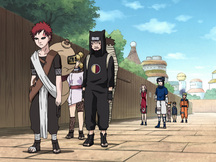 Naruto und Sakura haben Sasuke endlich erreicht und unterstützen ihn im Kampf gegen Gaara. Doch auch als Team scheinen sie gegen die unheimlichen Kräfte von Gaara keine Chance zu haben. Derweil kämpfen Kakashi und Guy immer noch in der Arena gegen die Eindringlinge. Trotz der brenzlichen Situation kann Guy seinen ständigen Konkurrenzkampf mit Kakashi zwischen ihnen nicht vergessen.