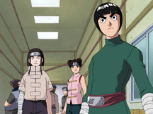 Je näher der Termin für die ChuNin-Auswahlprüfung kommt, desto mehr Kandidaten treffen ein, und desto nervöser werden alle. Denn unter den Neuankömmlingen sind doch einige, denen man nicht unbedingt trauen kann. Sasuke nimmt sich einen von ihnen vor. Es ist Lee, ein Junge, der etwas arrogant wirkt, und der auch gleich andeutet, dass er gerne zeigen möchte, was er drauf hat. Zuerst einmal gesteht er Sakura seine Liebe, die wehrt aber sofort ab. Dieses Liebesgeständnis bringt Naruto auf die Palme und er fordert Lee heraus. Der Kampf währt nur kurz, weil Lee ein verbotenes Jutsu anwendet. Dann kommt es zu einer Auseinandersetzung zwischen Sasuke und Lee, den die Herkunft Sasukes nicht im geringsten interessiert. Es wird mit harten Bandagen gefightet, und auch hier wendet Lee nicht immer legale Mittel an, sodass Sasuke bald am Boden liegt. Aber er gibt nicht auf. Als es immer dramatischer wird, taucht plötzlich Lee`s Lehrer auf. Er ist entsetzt, dass sein Schüler mit unsauberen Techniken arbeitet, und Lee gibt am Ende klein nach.